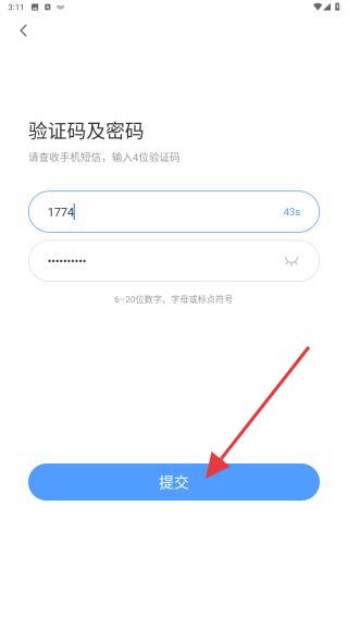 4、将收到的验证码、密码输入进去后,点击提交的按钮即可完成注册。