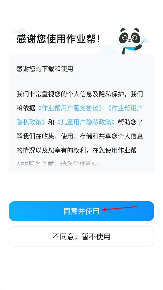 1、打开作业帮App,出现感谢使用提示及协议说明,点击同意并使用按钮。