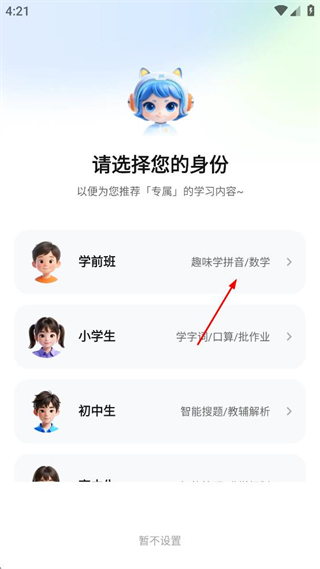 2、进入身份选择页面,找到学前班选项,点击该选项选定对应的学习身份。