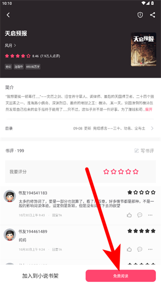 1、打开小小追书APP,在书城热门TOP中选择天启预报书籍,进入书籍详情页。