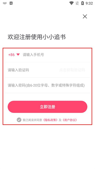 4、在注册页面依次输入手机号、获取并填写验证码、设置密码,勾选协议后点击立即注册。