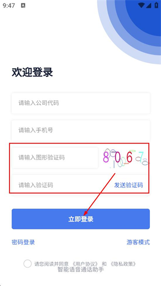 2、在验证码登录界面,填写请输入公司代码和请输入手机号对应的内容。