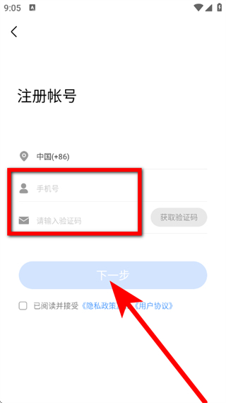 4、在注册页面,输入手机号和验证码,点击下一步。