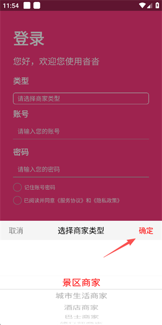 1、在沓沓的登录页面点击请选择商家类型,弹出商家类型选择界面。