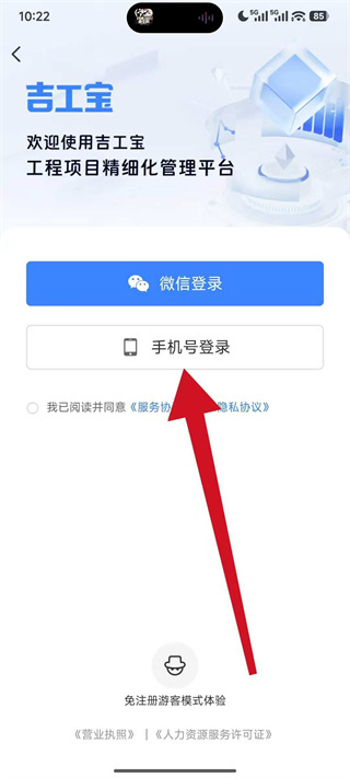 1、打开吉工宝,进入欢迎页面后,点击其他方式登录,进入登录方式选择页面。