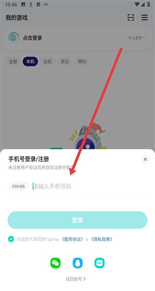 如果你想玩taptap中的云游戏,首先得登录账号。如果没有账号,同样也是像下面一样操作。