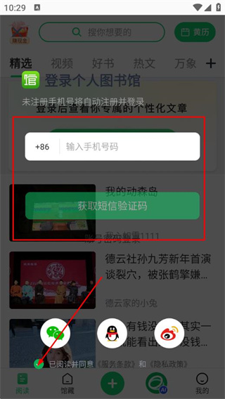 2、在登录界面输入手机号码,勾选协议后点击获取短信验证码。