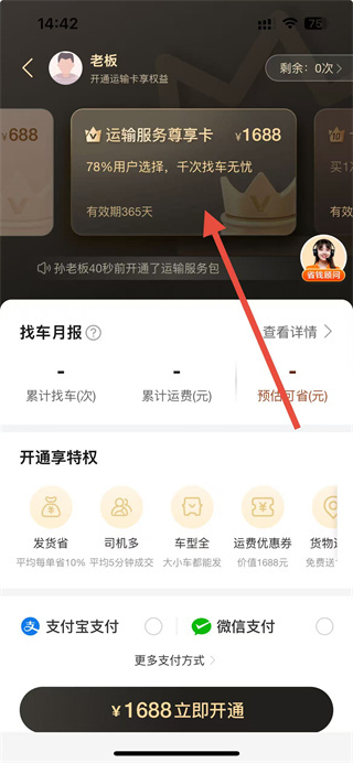 3、在会员开通界面,选择运输服务尊享卡等会员类型。