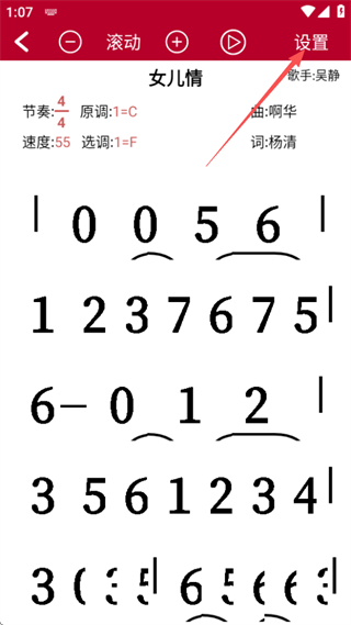 2、在简谱页面,点击右上角的设置按钮,可进入设置页面。