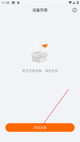 2、进入设备列表界面,若显示暂无可用设备,请先添加,点击下方的添加设备按钮,启动设备添加流程。