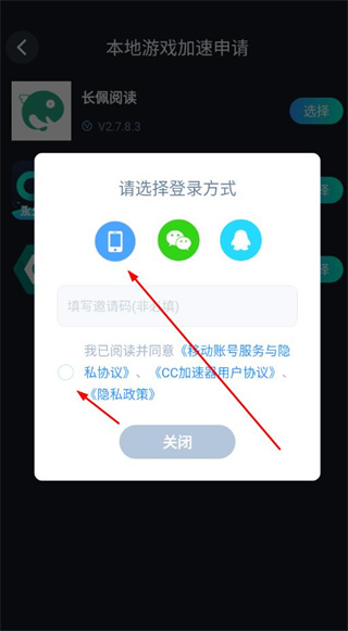 3、在弹出的登录方式选择窗口中,选择登录方式并勾选同意相关协议,即可将该本地应用添加到CC加速器中。