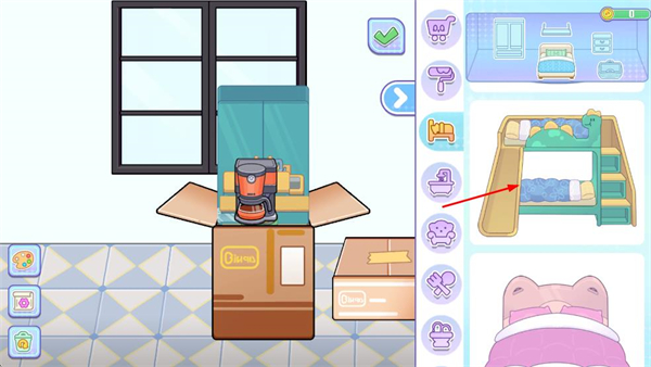 3、在室内场景右侧栏选择床铺类家具,将其布置到当前室内空间内。
