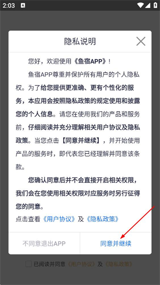 1、勾选已阅读并同意后,点击同意并继续,进入鱼宿APP的登录页面。