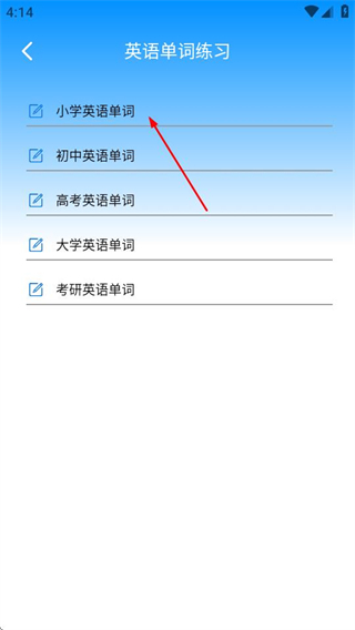 2、在英语单词练习页面,选择目标学段,可进入对应学段的单词练习列表。