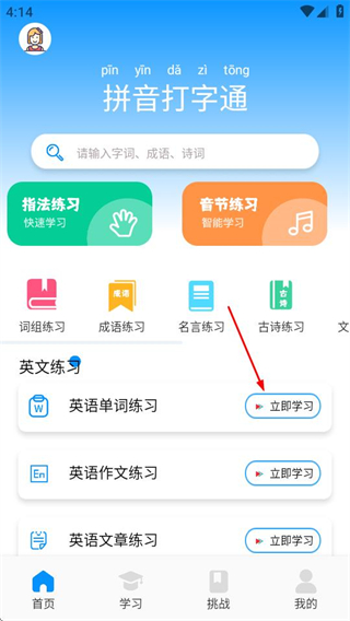 1、进入首页后,在英文练习板块点击英语单词练习的立即学习按钮,可进入英语单词练习页面。