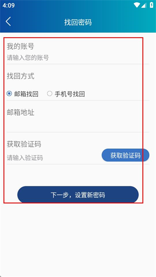 2、在登录页面,点击忘记密码选项,可进入找回密码页面。