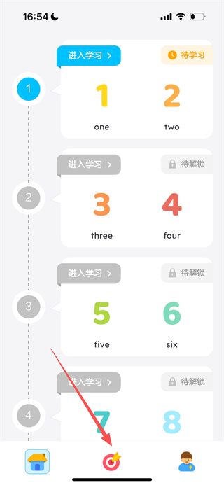 1、进入首页后,点击底部的中间功能按钮,可进入单词学习页面。