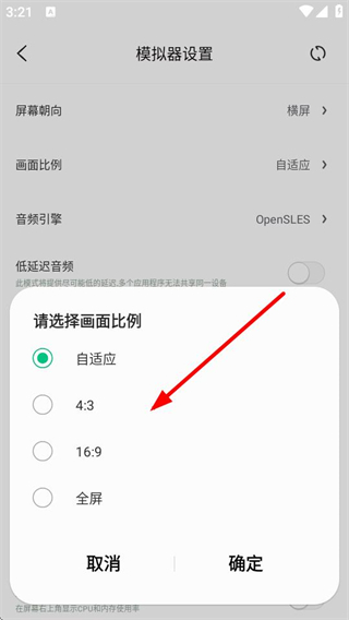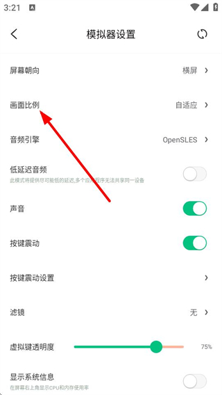 3、进入模拟器设置界面后,找到画面比例选项并点击。