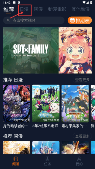 1、打开动漫类APP首页,点击顶部日漫板块,进入日漫页面。
