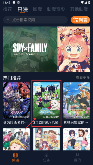 2、在日漫页面,点击3年Z组银八老师动漫条目,进入动漫详情页面。