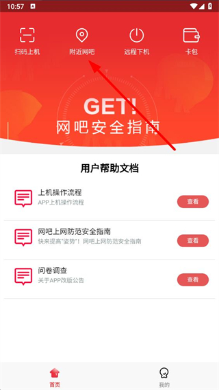 2、首页有扫码上机、附近网吧、远程下机功能,直接使用易上网APP扫描网吧电脑上的二维码,就能快速上机。