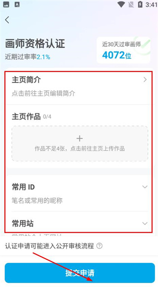 4、在画师资格认证页面,完善主页简介、上传至作品、填写常用ID等信息后,点击提交申请等待审核。