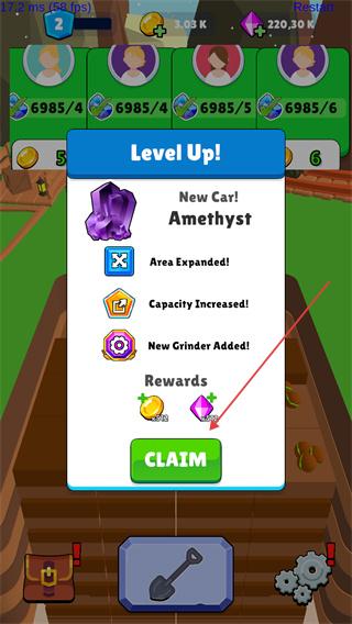 3、等级提升后,点击CLAIM按钮领取奖励,解锁新矿车及扩展区域等功能,提升挖掘效率。