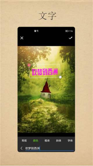 文字支持字体、大小、颜色、阴影自定义,涂鸦笔触粗细可调,贴图可自由缩放旋转,让用户摆脱模板束缚,根据喜好打造专属风格的照片作品。