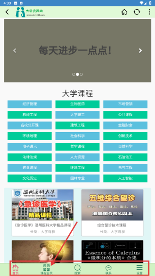 1、进入大学资源网主界面,点击底部功能栏中的课程目录选项,查看课程分类。
