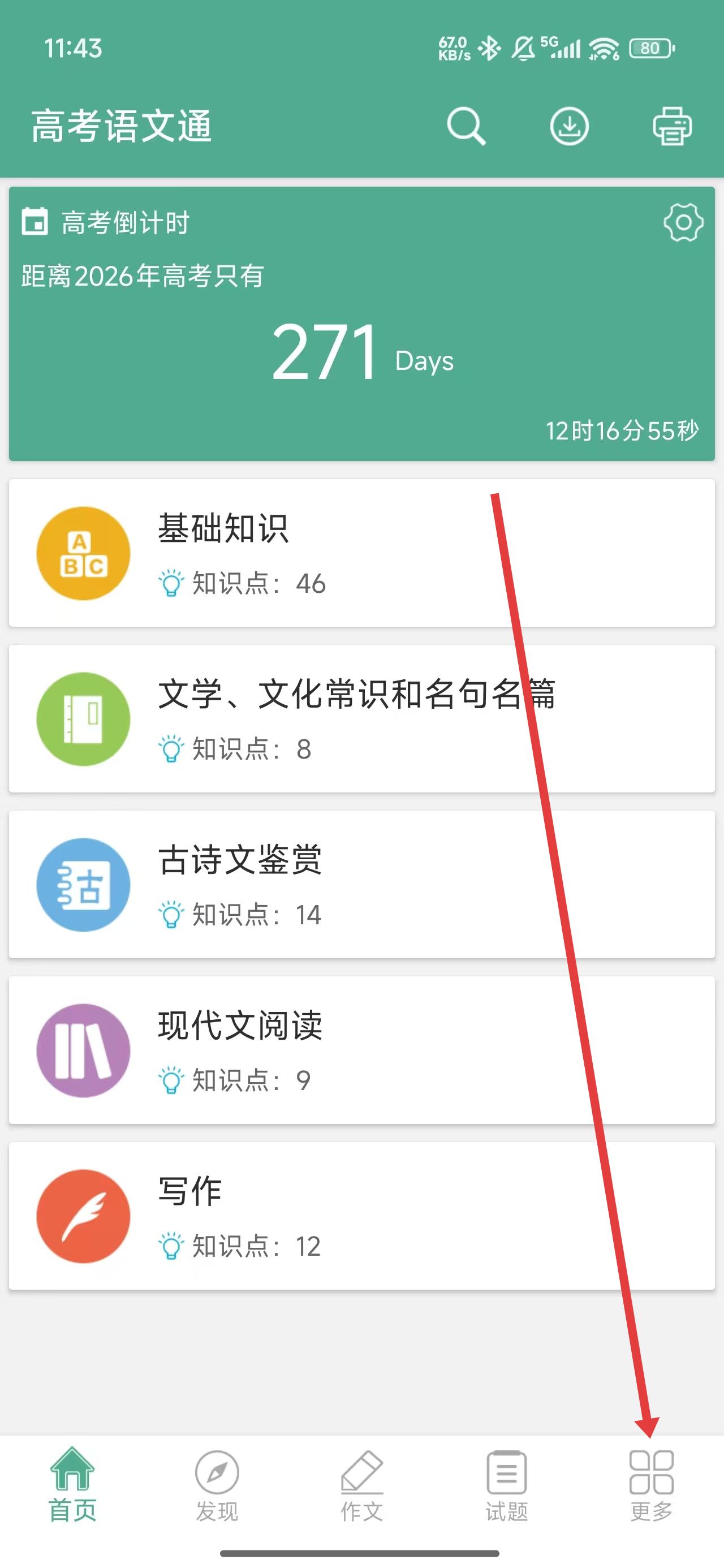 2、在高考语文通首页中,可以点击右下角的更多按钮,可跳转查看更多功能。