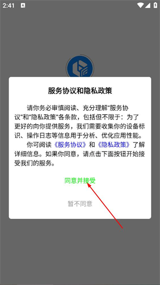 1、阅读服务协议和隐私政策后,点击同意,进入乐卡助手的登录页面。