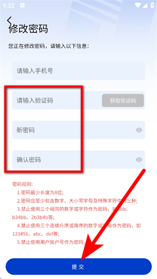 5、输入验证码,设置新密码,点击提交,完成密码重置。