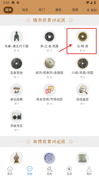 2、在论坛页面,点击元明清板块,进入元明清钱币讨论欣赏区。