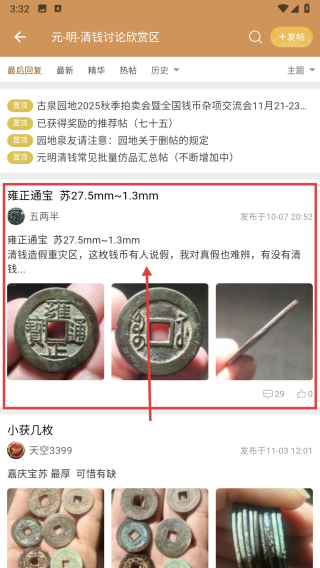 3、在元明清钱币讨论欣赏区,点击雍正通宝 苏27.5mm~1.3mm的帖子条目,进入帖子详情页面。