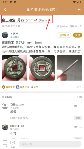 4、在帖子详情页面,即可查看关于这枚雍正通宝的讨论内容、图片及藏友的鉴定交流信息。