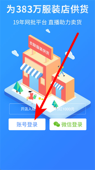 1、在衣联供货商的启动页面,点击账号登录选项,进入登录页面。