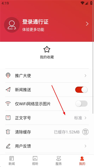 2、在个人中心页面中,点击正文字号选项,可进入正文字号设置页面。