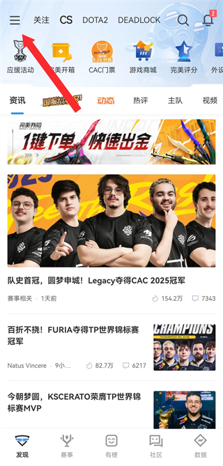 1、打开完美世界电竞app,点击左上角菜单图标,进入个人功能页面。