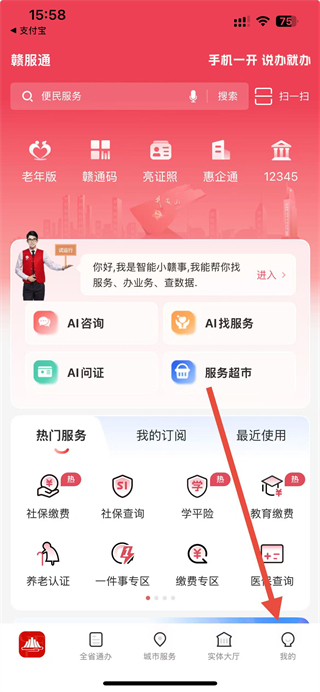 01、打开赣服通app或者在支付宝中搜索“赣服通”选择官方应用进入,切换所在地,并授权登录