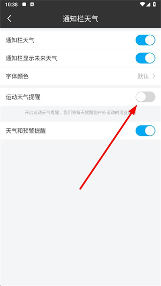 4、在通知栏天气界面,找到运动天气提醒对应的开关按钮,点击开启即可启用该提醒功能。