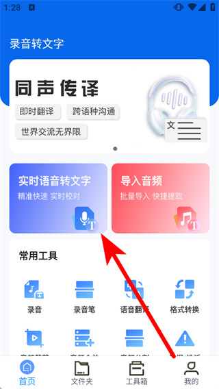 1、打开录音转文字类,在首页找到并点击实时语音转文字功能,进入转换页面。