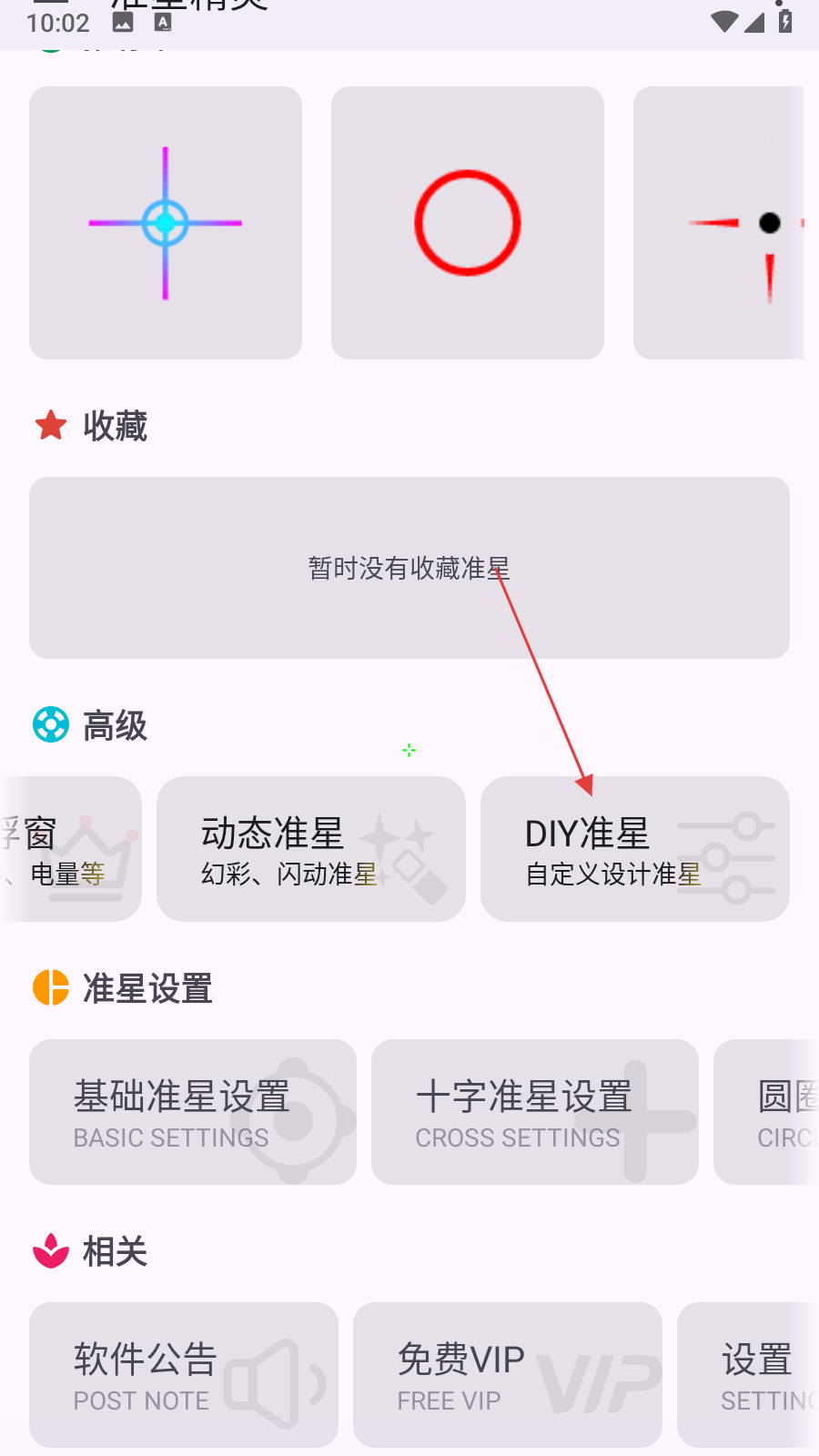 1、打开准星精灵应用,在主界面高级分类下点击DIY准星选项,弹出DIY准星类别选择窗口。