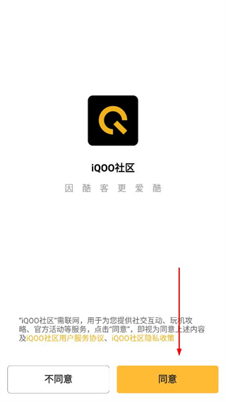 1、查看iQOO社区的相关协议提示,点击同意按钮,进入应用主界面。