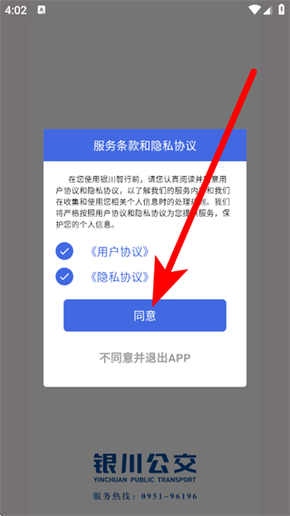 1、打开银川智行应用,在服务条款和隐私协议弹窗,点击同意。