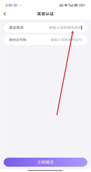 2、在实名认证界面输入真实姓名后,点击立即提交按钮。