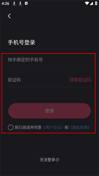 3、在手机号登录页面,输入快手绑定的手机号、获取并填写验证码,勾选协议后点击登录。