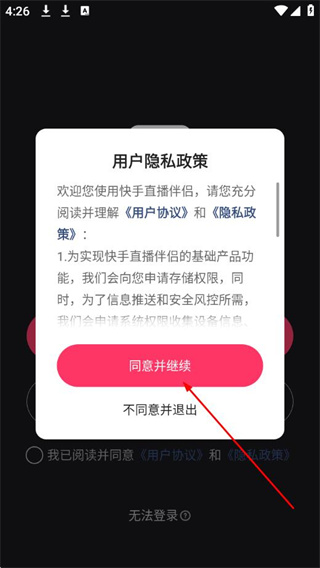 1、打开快手直播伴侣app,勾选我已阅读并同意协议,点击同意并继续,进入登录选择界面。