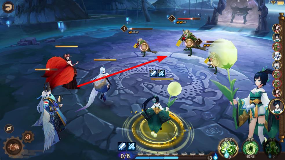 3、轮到己方角色行动时,点击选择技能并选定敌方目标进行释放,以此开展切磋战斗。