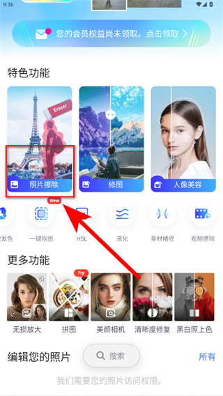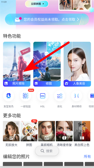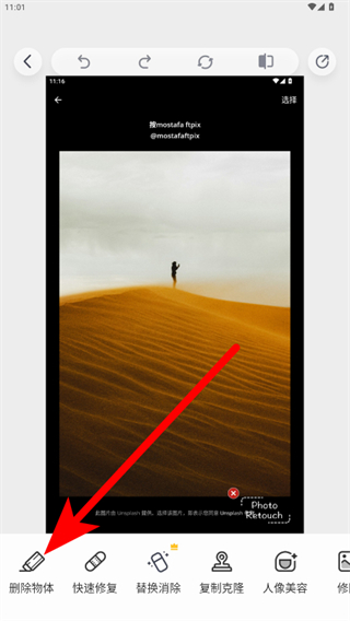 1、打开PhotoRetouch应用,点击照片擦除功能,进入图片选择界面。