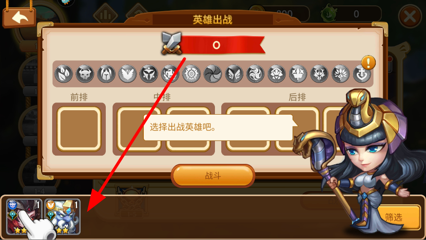 2、在英雄出战界面,从拥有的英雄中选择合适的英雄,安排到前排、中排、后排等位置,组成出战阵容,准备开启战斗。